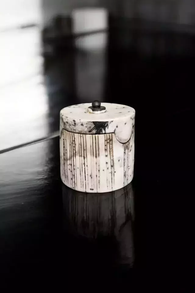 Peça artesanal com tampa, feita com a técnica Raku, apresentando um design cilíndrico e rústico. O esmalte craquelado em tons de branco e preto cria um efeito visual marcante, com nuances e texturas únicas resultantes do processo de queima. A tampa, com um pequeno pegador, complementa o design orgânico da peça. Ideal para guardar pequenos objetos ou como peça decorativa.